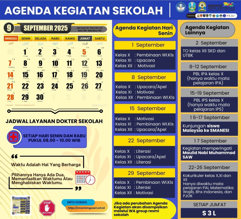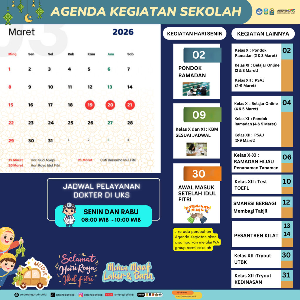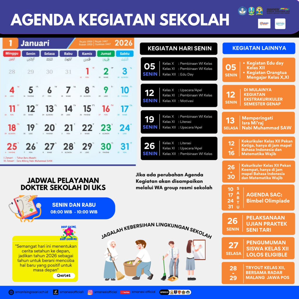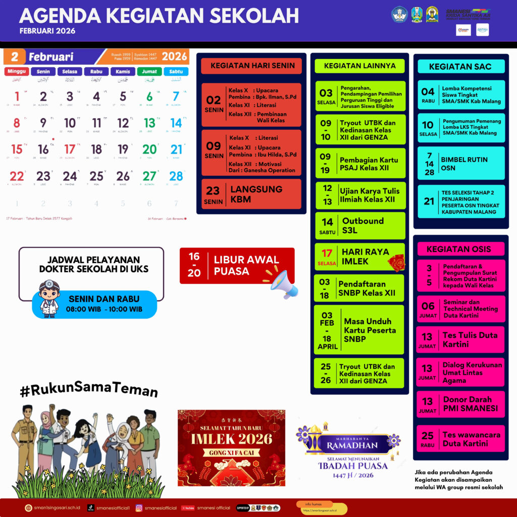 Dalam rangka memperkuat komunikasi dan kolaborasi dengan seluruh pihak, baik internal maupun eksternal, Bagian Kehumasan SMA Negeri 1 Singosari mempublikasikan agenda kegiatan rutin sepanjang bulan berjalan pada tahun pelajaran 2025/2026. Agenda ini disusun untuk memastikan transparansi dan partisipasi aktif dari seluruh warga sekolah, orang tua, serta masyarakat.