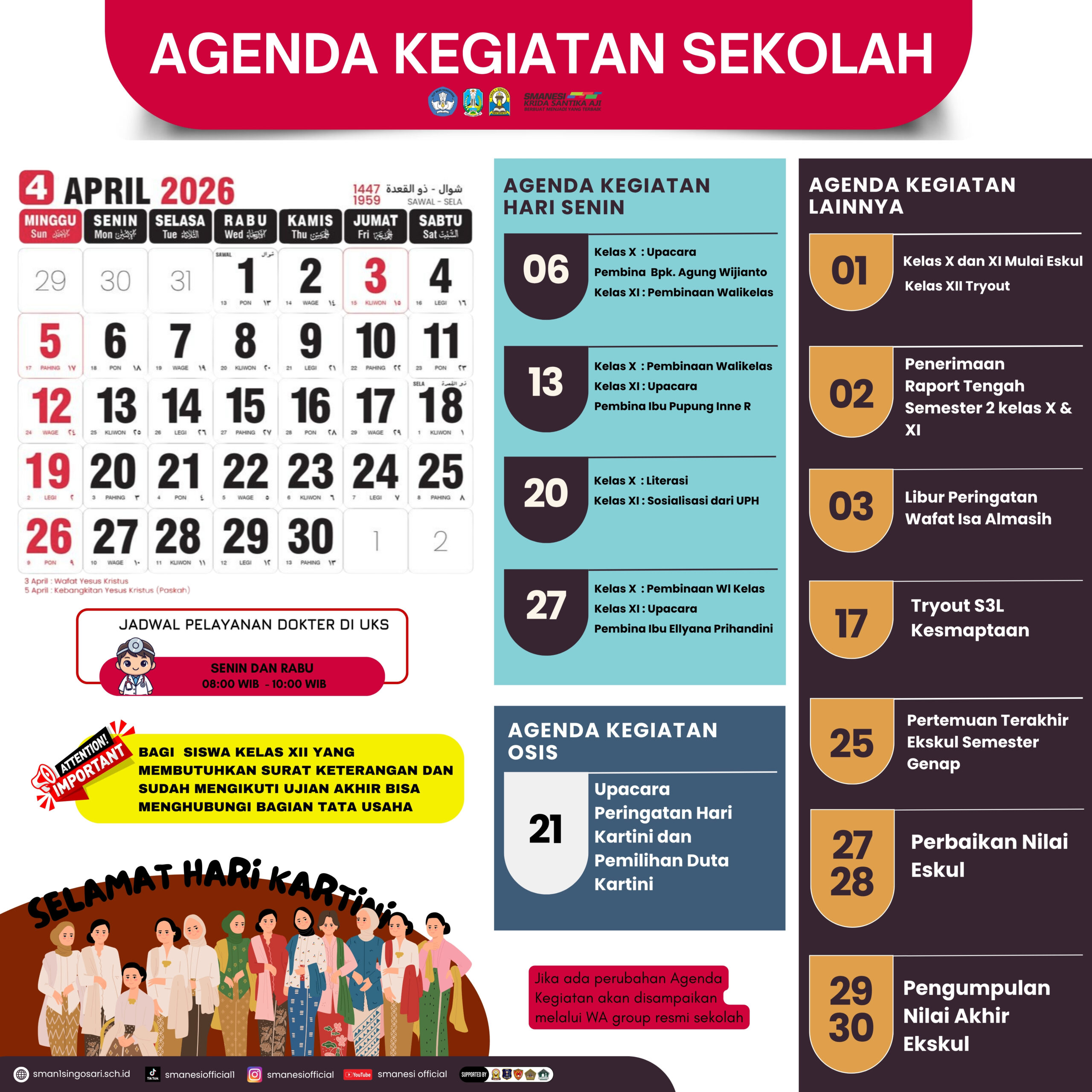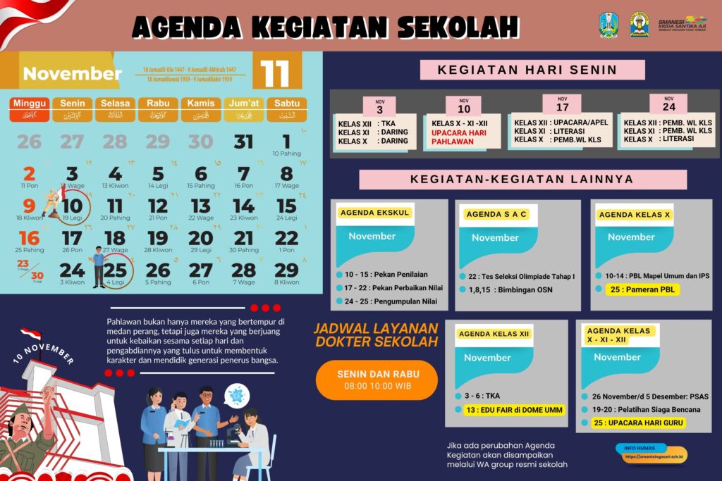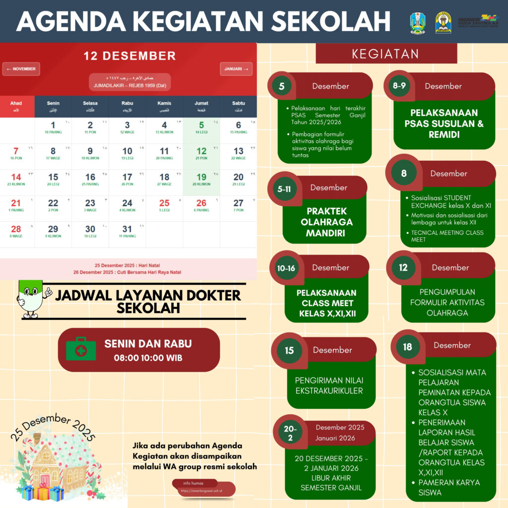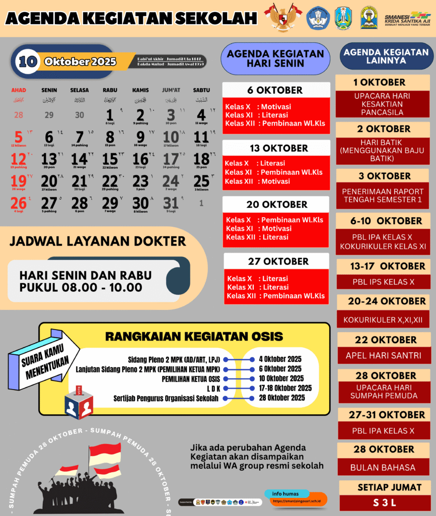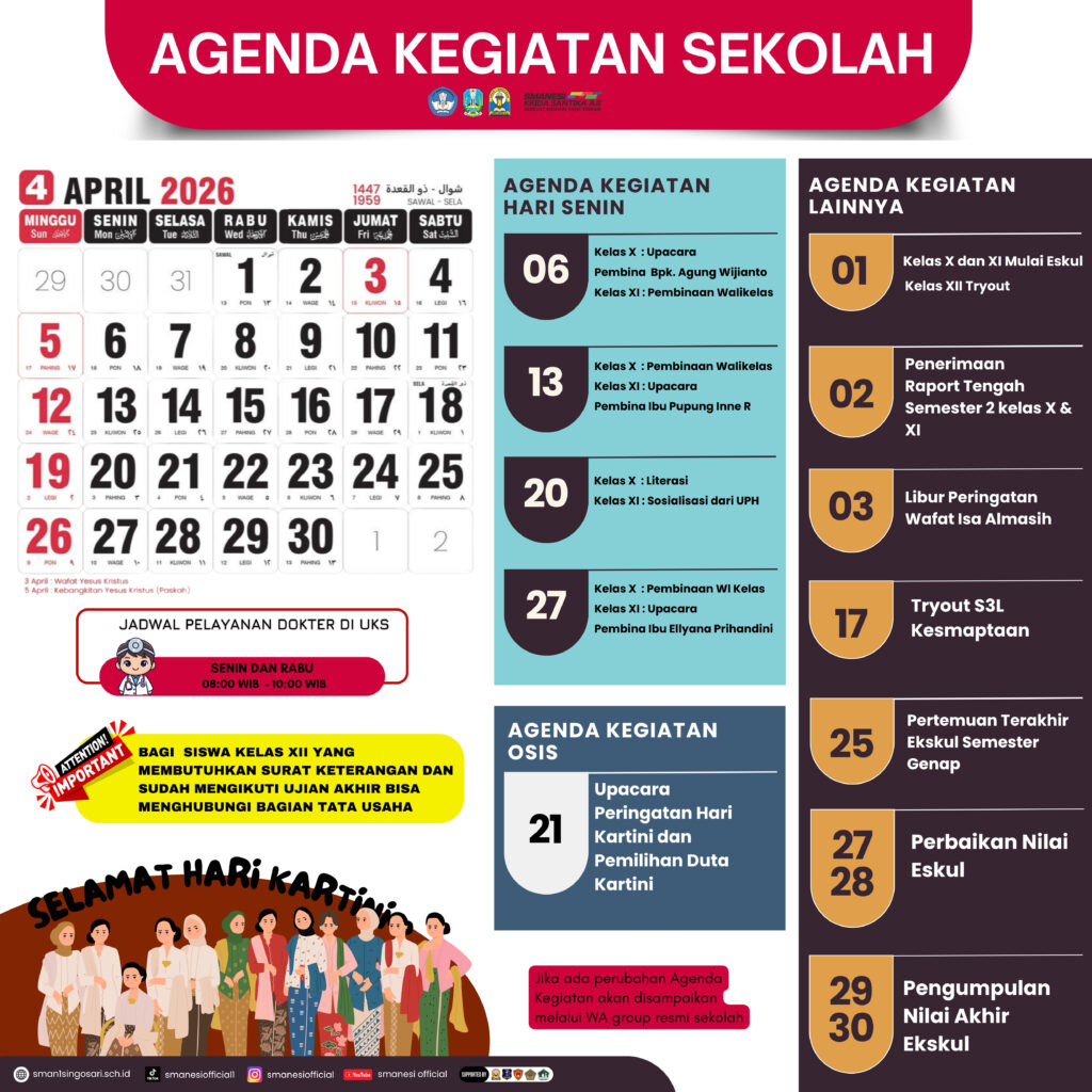 Dalam rangka memperkuat komunikasi dan kolaborasi dengan seluruh pihak, baik internal maupun eksternal, Bagian Kehumasan SMA Negeri 1 Singosari mempublikasikan agenda kegiatan rutin sepanjang bulan berjalan pada tahun pelajaran 2025/2026. Agenda ini disusun untuk memastikan transparansi dan partisipasi aktif dari seluruh warga sekolah, orang tua, serta masyarakat.